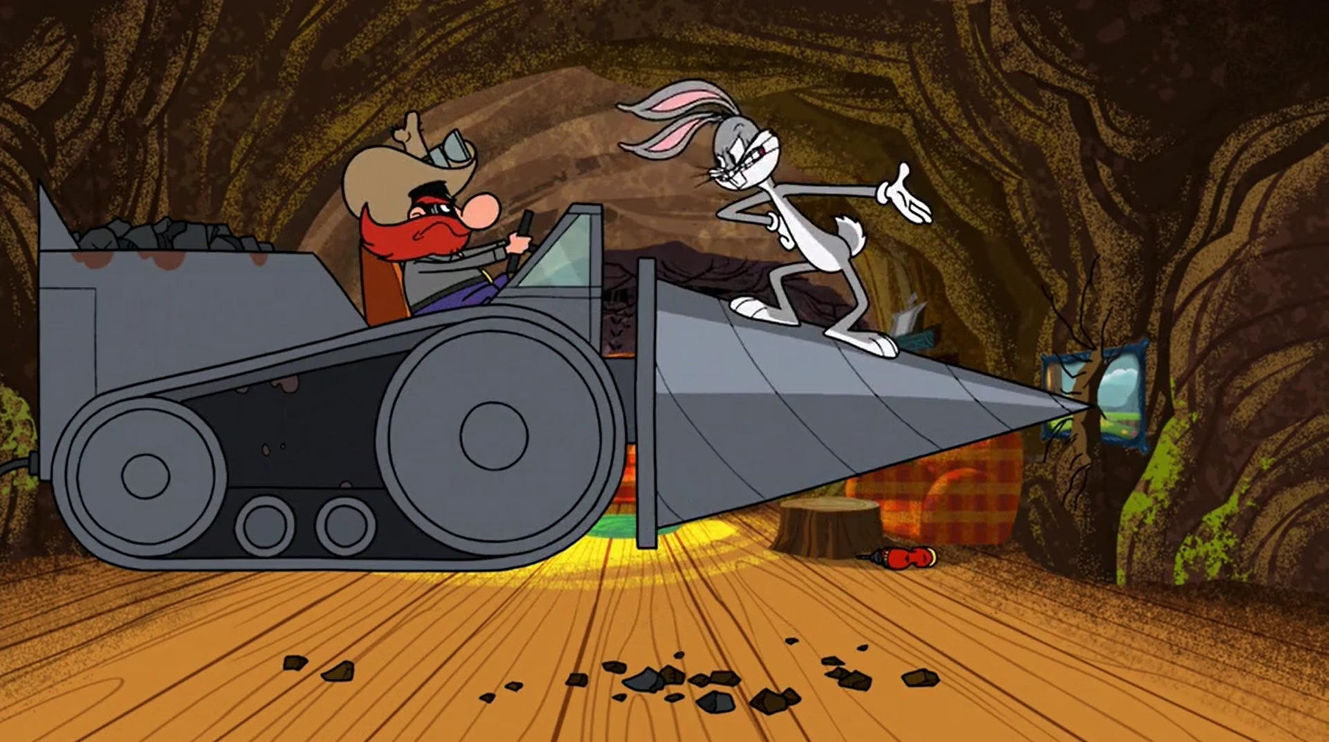 Yosemite Sam disturbs Bugs' peace when he mines for coal near his home.
